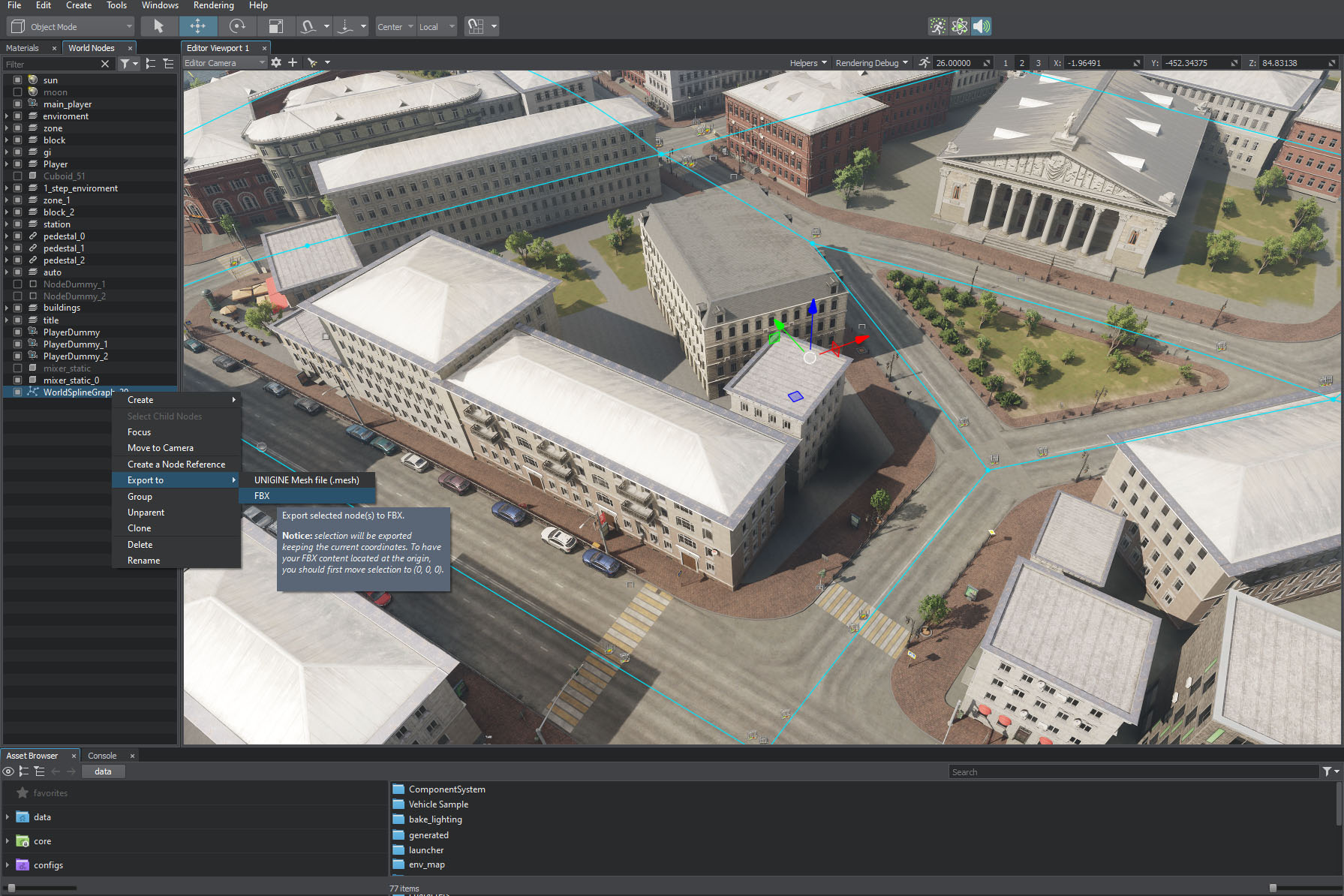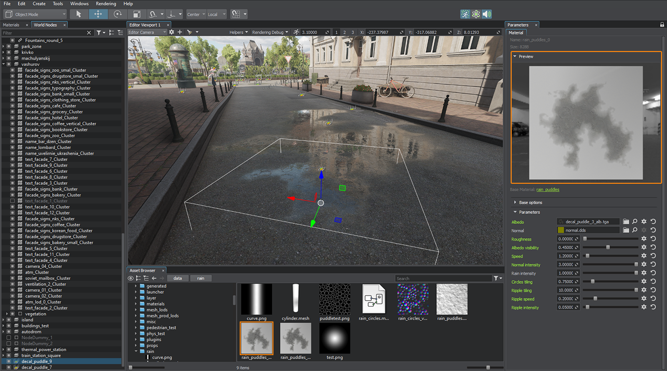 fox Posted March 10, 2022 Posted March 10, 2022 Key Changes Material graph editor: decals support, depth offset, and other improvements. World Spline Graph export to FBX. Automatic LOD generation. Water System changes. Sandworm tool updates. Image Generator improvements. Asset replacement tool. 2.5D Buildings Add-On. Notice: UNIGINE 2.15.1 SDK requires SDK Browser version 1.9.33 or later. This is primarily a maintenance release resolving a number of issues introduced in 2.15 although it brings a pack of features and improvements. Material Graph Editor Improvements Decals Support You can now create materials for Decals via the Visual Material Graph Editor. All types of decals are supported (Mesh, Projected, and Orthographic). A set of new graph nodes has been added to the editor, these nodes are intended to be used for decals only and have the "decal_" prefix. Adjustment of decal projection onto a surface has become more flexible. For example, for a Mesh Decal you can choose whether to take normals of the mesh into account or not, which is impossible to control via the decal_base material using the legacy workflow. Decal samples were added to the Material Graph Samples demo included in the SDK. Depth Offset The Material node has got a new input to control depth. This is widely used for impostors, for example. You can switch the mode from Offset to Override in the global settings in the right panel. Impostors Without Depth Offset Impostors With Depth Offset Inputs Constructor for Subgraphs and Loops On double-clicking an Inputs node of a subgraph or a Loop Begin node you'll see a fully-functional Input Constructor. It enables you to rearrange, rename, delete existing inputs as well as implicitly set their type. Warnings and Errors Panel Not only API can change in the next Engine update, but subgraphs and graph nodes that you use in your graph-based materials can change as well. To track these changes and provide you with timely notification if something has changed or went wrong and requires your attention we have added a new Warnings and Errors panel. The panel lists all problem nodes in the graph (if any), just select an entry to see the details about ports or data in the Message section. The list of other improvements includes: Fixed an issue with incorrect application of normal maps in graph-based materials. The Multiple Environment Probes option for graph-based Transparent PBR materials now works as expected. Fixed an issue with resetting a parameter to default value after cloning it in the Material Graph Editor. Fixed an issue with the Camera Direction graph node outputting an inverted vector. Fixed a "device removed" crash on zooming out too far in the Material Graph Editor. Fixed an issue with refreshing undocked Material Graph Editor window when switching tabs on double-clicking an *.mgraph asset. The Copy button for parameters in the Material Graph Editor now functions appropriately. The following new subgraphs were added: Get Vector From Basis Object Scale Angle Between Vectors Depth To Position Fresnel PBR Blue Noise 256x256 Animated Blue Noise 256x256 Static See Content Migration Guide for more details on changes in graph-based materials. Water System Refactored Distant Waves management for the Global Water object, with some optimizations and more straightforward naming (see the API Migration Guide for details), a normal map is now used instead of the heightmap. Fetch settings (SteepnessQuality and Amplitude Threshold) for the Global Water object now affect fetching of normals as well. Fixed incorrect Whitecap Intensity for certain Beaufort levels. Fixed issues with detecting intersections for the Global Water object, including the issues with water surface modified by the FieldHeight nodes. We have also added a new Intersection sample to the Water section of the C++ Samples suite, to demonstrate the impact of various fetching and intersection quality parameters that are available via API. Other Engine Improvements Fixed crashes and memory leaks when editing Landscape Layer Maps with brushes having the size that exceeds the size of the Layer Map itself. Fixed an issue with using Mask Terrain for scattering clutter objects over the surface of the Landscape Terrain. Attenuation Distance for Landscape Layer Maps using heightmaps with no opacity data is now taken into account during intersection detection, solving issues with incorrect intersection results in corresponding areas. Fixed default flags set in the Texture::create() method. Fixed an issue with the Mesh::addCylinderSurface() method causing incorrect UV generation for cylinder sides. Added support for x=North, y=East orientation, enabling correct operation with custom projections like EPSG 31468 used in the Sandworm tool without data flipping. Fixed repeated re-generation of texture cache (.cache_textures) for runtimes having no assets. Fixed an issue with rotating child particles when changing the transformation of a parent Decal node. Fixed formatting in the C# MathLib ToString() method. Fixed an issue with reimporting property files sometimes causing Editor freezes. Fixed memory leaks on OpenGL for the ObjectBillboards occurring when changing positions via the setBillboardPosition() method. Added an ability to skip render mode check for TAA by enabling TAA Offset when using Viewport::renderNodes() with the VIEWPORT_RENDER_DEPTH flag set. The Texture::load() method now creates an unordered access view when loading a texture with the Texture::USAGE_READWRITE flag set. Fixed an issue with incorrect baking of clouds having the Interleaved Rendering option enabled to an Environment Probe. Fixed an issue causing objects with the Deferred Buffers option disabled to be ignored by the Environment Probe Cutout by Shadow feature. Fixed an issue with using IES profiles for Omni light sources. Fixed an issue with ObjectWaterGlobal rendering on OpenGL, causing an "Invalid Operation" error. Fixed an issue with incorrect rendering of