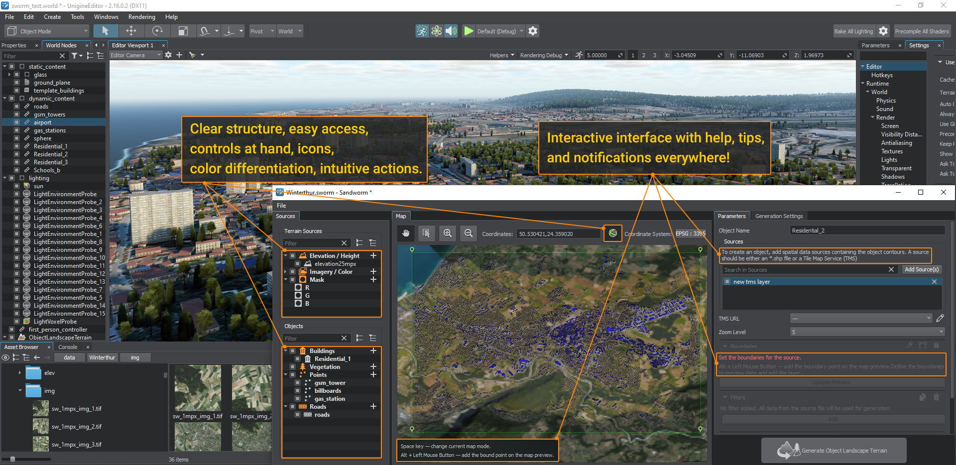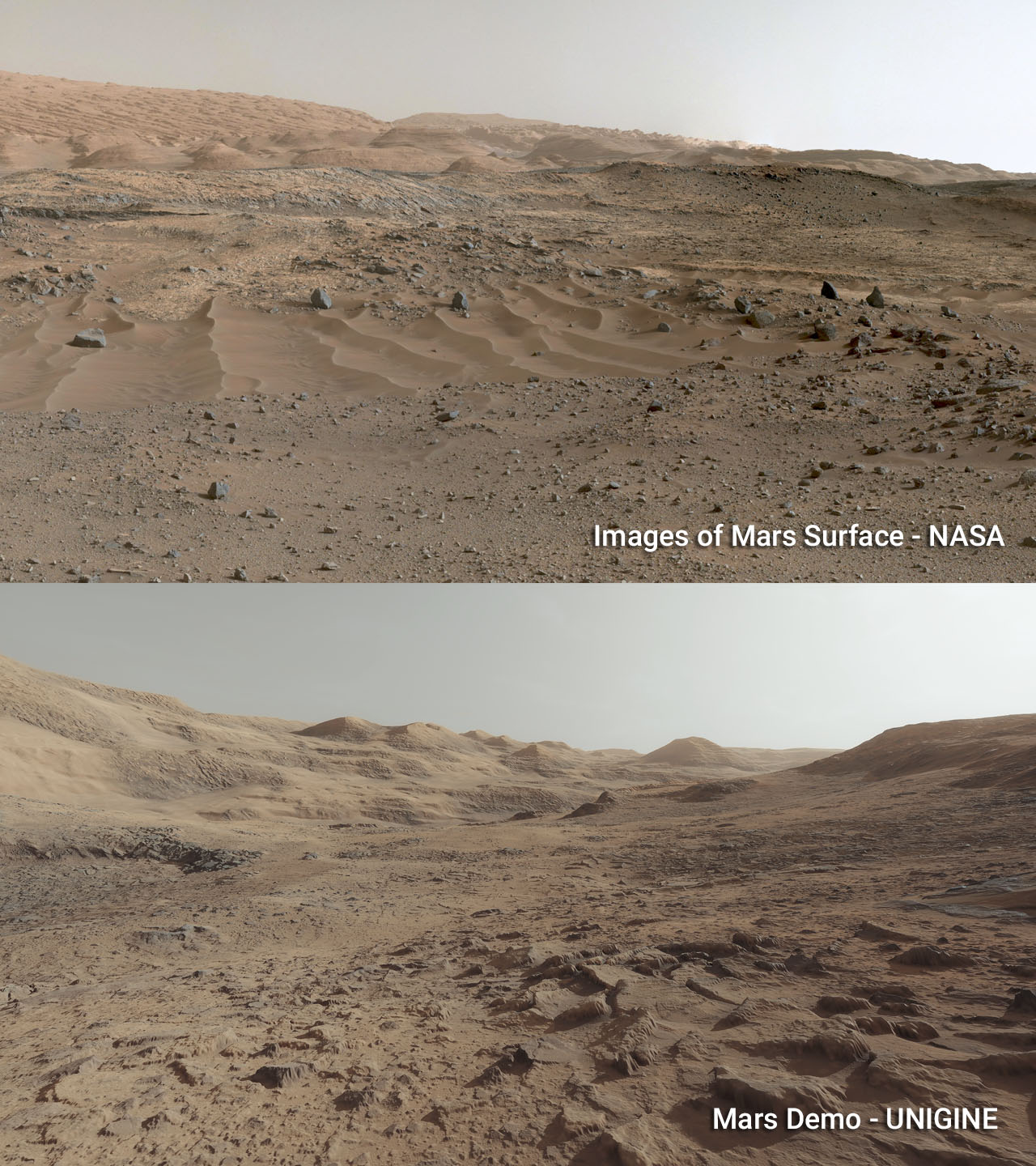 fox Posted October 10, 2022 Posted October 10, 2022 Key Changes DirectX 12 and Vulkan API support (experimental). Double precision in Community edition. Completely revamped window manager. Integration of .NET 6 (C# 10). Material graph editor: support for post effects and water decals, other improvements. Renderer improvements: screen-space reflections, bloom, motion blur, camera effects, etc. Better streaming and other Landscape Terrain updates. Sandworm tool UX/UI upgrade. Editor API: Assets. New brush-based Texture Editor. ROS (Robot Operating System) integration. Varjo XR hand-tracking. IG improvements for helicopters. SDK Browser 2. Asset Store. Mars demo in Community edition. Notice: UNIGINE 2.16 is intended for use with the new SDK Browser v2 (not supported in the old SDK Browser). If you don't have the new version, please download it and install. This release brings you long-awaited double precision in Community edition, Vulkan and DX12 support (experimental), a new Texture Editor along with a huge pack of Editor improvements including API for assets management, as well as IG updates, rendering improvements, and a lot more. DirectX 12 and Vulkan (Experimental) Another couple of things that you have waited for and requested many times - experimental DirectX 12 and Vulkan versions of the engine are available for everyone starting from 2.16. One might ask: why waiting for so long, DX12 is there since 2015 and Vulkan came out in 2016? Well, there were reasons for that: Low quality of drivers - it's no secret that it is the driver that defines performance and reliability of any graphics API for the end user. Poor support from vendors at early stages, half-baked drivers were ranged from very unstable to almost non-functional (sometimes Vulkan drivers were calling OpenGL commands inside). Negative experience of porting AAA games, that suffered from driver problems (occasional freezes, application crashes, unstable behavior, etc.). No new libraries, technologies, and tools for DX12 and Vulkan at the beginning. Unclear profit regarding performance - neither of these APIs offered any significant performance gain at first (resulting in low motivation to support them). Windows 7 that we had to support as a lot of our enterprise customers have stuck to using it, and were not so eager to switch (meaning no DX12, as it requires at least Win10). So, unclear profit along with high risks and costs (including time) made the whole task impractical back then. Now things changed, both APIs matured along with drivers, and the time has come along with motivation: Support for new platforms including consoles (e.g. XBox uses DX12), mobile, etc. Both Vulkan and DX12 are low-level APIs that give developers more control, interfere less, and provide direct hardware access with minimum overhead. These APIs offer a significant CPU gain which is critical for many applications as they usually have a CPU bottleneck (managing huge numbers of objects especially complex ones requires a lot of CPU resources). Hardware-accelerated raytracing DXR/VKRay (should be noted, that software raytracing was used in UNIGINE long before Vulkan and DX12 appeared) along with other new technologies not available for DX11/OpenGL, like VRS, Mesh Shaders, Async Compute, Wave Intrinsics, etc. Vulkan is a lot faster than OpenGL which is the only option for Linux (used by many of our enterprise customers). Apart from being slow, OpenGL requires a lot more time and effort to implement the same Engine features developed for DirectX and make them work, which slows down development process. What We Have Now Vulkan can bring you up to 100-200% CPU and 30% GPU boost, as compared to OpenGL implementation. DirectX 12 - doesn't offer that much, but it's still a good plus - up to 15-60% CPU, as compared to DirectX 11. First we test new versions in our internal projects. Further Development Vulkan and DX12 versions of the Engine are not production-ready yet, and some features will be missing in 2.16 (like both terrains, SRAA, occlusion queries, and support for multiple windows). Missing functionality is currently being added and is to become available in future releases along with bugfixes and improvements. We keep pushing to make the performance even higher or at least keep it comparable. The Engine is also being ported to game consoles. The Xbox Series X/S as well as the PlayStation 5 version both look almost feature-complete. Improved Reflections We have significantly improved the look of screen-space reflections (SSR). Sky and clouds are now rendered in reflections further improving visual consistency of the final image along with significant noise reduction and clear reflections of small objects. Old Blinn-Phong BRDF has been replaced with GGX making the look of reflections on rough surfaces more natural. Screen-Space Reflections Off Screen-Space Reflections On 2.15.1 2.16 SSR settings are rather sophisticated therefore it is strongly recommended to use standard presets, especially in case you had used a Custom preset earlier. Screen-Space Shadow Shafts Added volumetric screen-space shadow shafts. Shadow shafts (aka light shafts) can be generated in screen space for the Sun and the Moon to simulate the real world effect of crepuscular rays, or atmospheric shadowing of atmospheric in-scattering. These rays can add depth and realism to your scenes. The new screen-space shadow shafts replace the previous implementation, as they affect haze and environment, do not cause excessive darkening of the final image, and work for both the Sun and the Moon. There are certain limitations for this feature - it doesn't work with water and transparent objects, and there are known issues on multi-display systems as well. 2.15.1 2.16 Better Motion Blur Implementation of the Motion Blur effect has been revamped. The main change is that there are no distinct sharp silhouettes between moving objects and the ones that remain static making the effect look more realistic